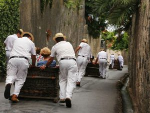 Ao longo de um trecho de dois quilômetros de extensão, que já foi declarado pela CNN um dos trajetos mais fantásticos do mundo, os visitantes descem ladeiras íngremes, a bordo desses cestos puxados por carreiros, como são conhecidos esses homens de roupa branca e chapéu de palha que usam as próprias botas de solas grossas como freio.